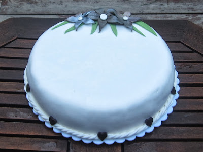 Kuvasta tuli vähän synkkä kun ei aamuvarhaisella kauheasti vielä aurinko paistellut. Mutta eiköhän tuosta selvän kuitenkin saa. :) Kakun välissä on puolukkamousse (puolukoita survottuna, vatkattua vispikermaa, tuorejuustoa ja sokeria keskenään sekoitettuna). Päällinen on vaniljan makuista sokerimassaa ja myös kukat terälehtineen ovat sokerimassaa. Sydämet suklaata. Tuo kakun alareunan kierrenauha on tehty lasten muovailuvahapuristimella... :D Tottakai uudella, ei-muovailuvahakäytössä-olleella ja tarkasti pestyllä sellaisella. Pitkään olen jonkinlaisesta sokerimassapuristimesta haaveillut, mutten ole oikein löytänyt sopivaa mistään. Tuo muovailuvahapuristin osui sitten silmään kaupan leluosastolla ja tarttui mukaan. Eikä hintakaan päätä huimannut ;)